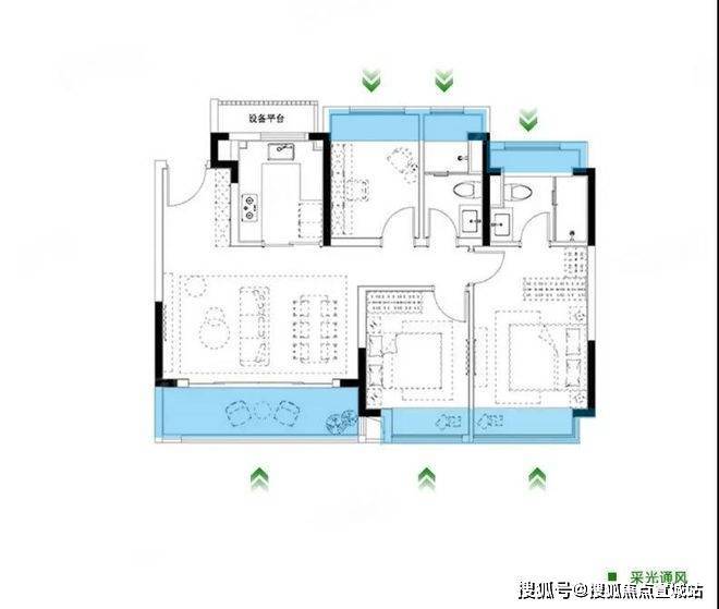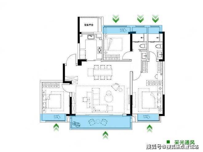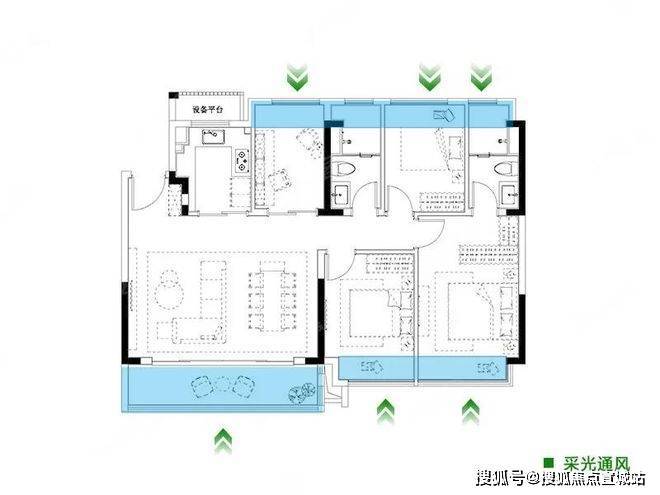 户型方正,横厅设计,大面宽四开间朝南,南向总开间11.7米。空间采光性极强;主次卧加卫生间皆带飘窗(边户),衣帽空间,储物空间优渥,实用性强;但玄关直接对望餐厅与客厅,一览无遗,隐私性相对降低,稍显不足。首置和三口之家可以考虑选择。