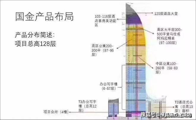 T1地下5层,地上128层,高达450米(包含甲级办公楼,高端住宅公寓、特色精品尼格罗酒店)