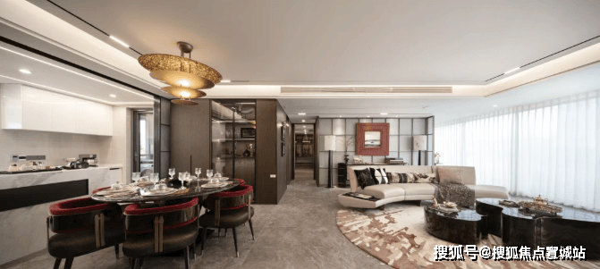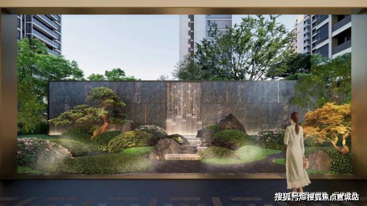 步入归家大堂,是又一层惊艳。3块长约3米的玻璃拼接而成一面大的落地玻璃窗,望出去是灵动的山水框景,以《千里江山图》为灵感的山水意境顷刻展现出来。