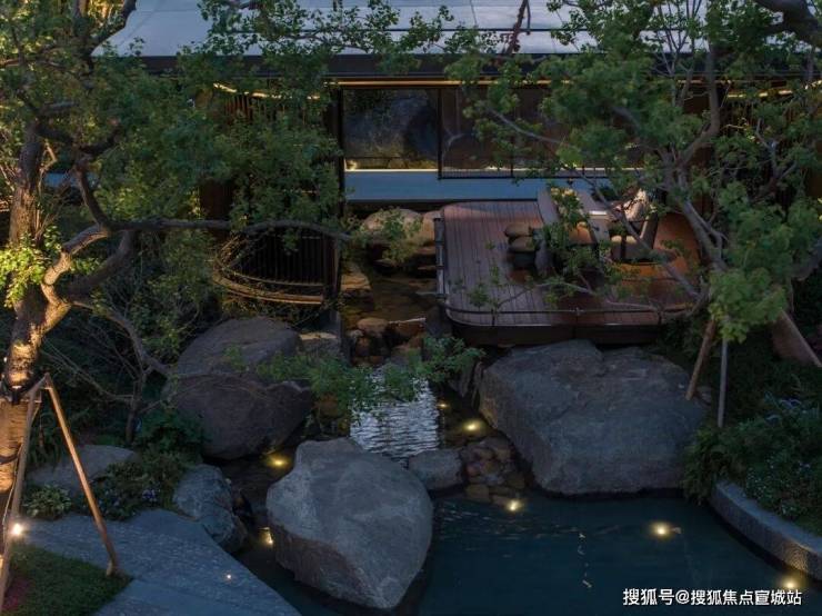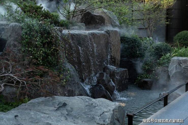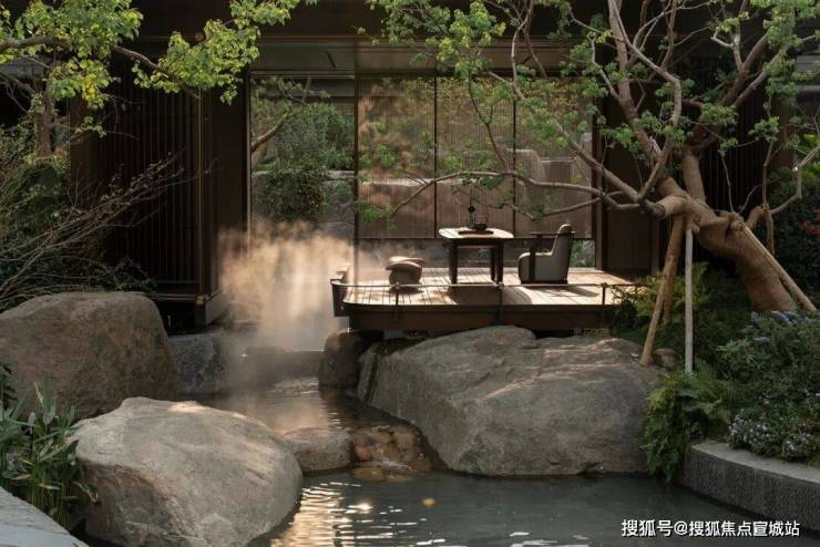 置一茶轩悬浮于石溪之上,水从底部石上流出,深郁的山坳间腾起云雾,弥漫浮动,吞吐变灭。山石自然参差,有沟涧、宽溪、石隙,水在其间流淌、跌落,激荡自然而然的山水清音。山苍树秀,水活石润,青山自青山,白云自白云,世事流淌人在其间,纷扰的尘嚣远去,喧嚣的声音荡尽,回归最原始的静寂的天地。