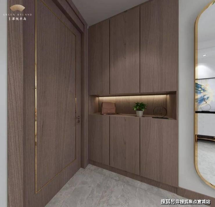而入户玄关柜,采用了三段式玄关柜设计,上中下各设收纳分区,保持了整个空间私密性的同时,在空间使用率上又做到了合理分配。上层收纳区可用于收纳使用频率不高的家居或换季鞋服;中层物件区悬空并设置了内打灯,可摆放观赏性摆件/家庭相簿、钥匙等小物件,温馨十足;下层常用区可收纳常用鞋、拖鞋等,空间大,可满足全家鞋子收纳需求。