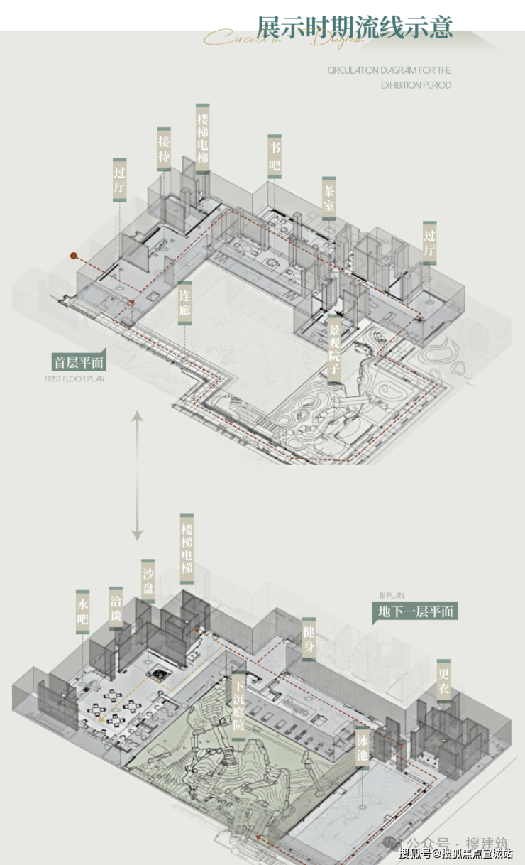 地块2.0的容积率,规划了小高层+叠拼的业态组合,东西分区,各自形成组团,西高东低,与东侧绿地共融。内部打造了南北向中央景观轴+下沉庭院景观核心,结合下沉庭院和架空会所,营造步移景异,层层递进的沉浸式归家体验。
