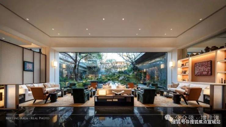 接待区与洽谈区采用超尺度整块玻璃幕墙,消融室内外界限,将下沉庭院与后场景观引入室内,使整个空间成为自然的延伸。