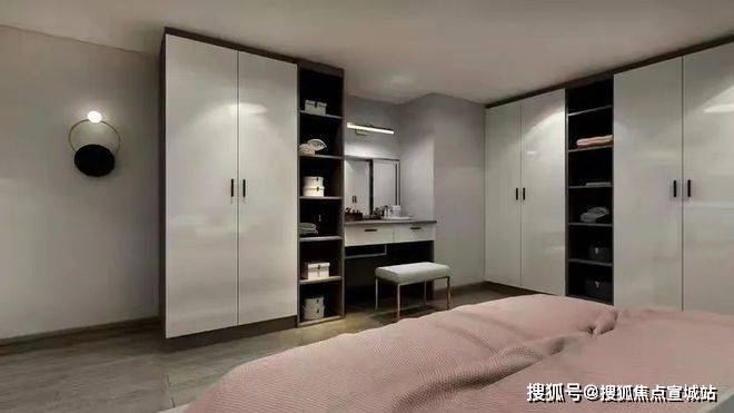 卧室的设计相较于客厅来说,更显温馨。香槟色的线条在灰色基调里跳跃纷飞,玫瑰金与军绿色的四件套简直是简约轻奢的极致搭配。再配上隐藏在墙里的温柔光线。一切既奢华又温馨。
