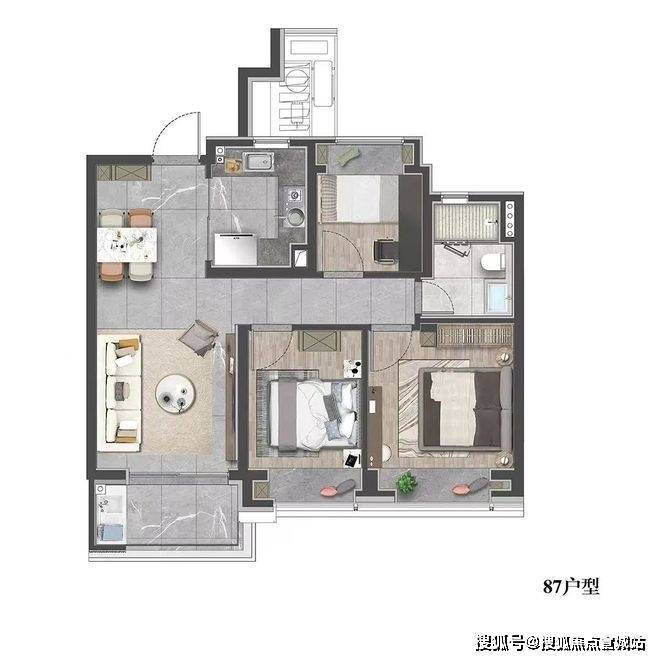 建面约87㎡3房2厅1卫户型图: