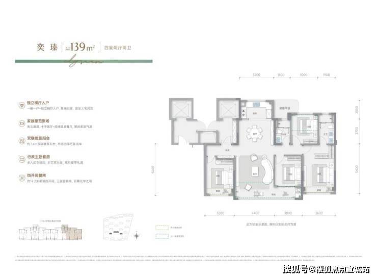 建面约139㎡四房两卫户型:堪称改善家庭的终极选择:独立梯厅入户,类一梯一户设计,尊享私密与静谧四开间朝南;约14米奢阔面宽,阳光满室铺展;餐客一体宽境,约7米阔绰开间,满足大家庭聚会需求;南面双联阳台,瞰景晾晒两全,兼具生活与诗意。
