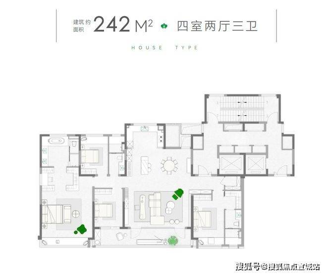 南向面宽极致化:所有户型均实现南向四开间布局,其中242㎡户型南向面宽达20.7米,主卧套房面宽5.4米20