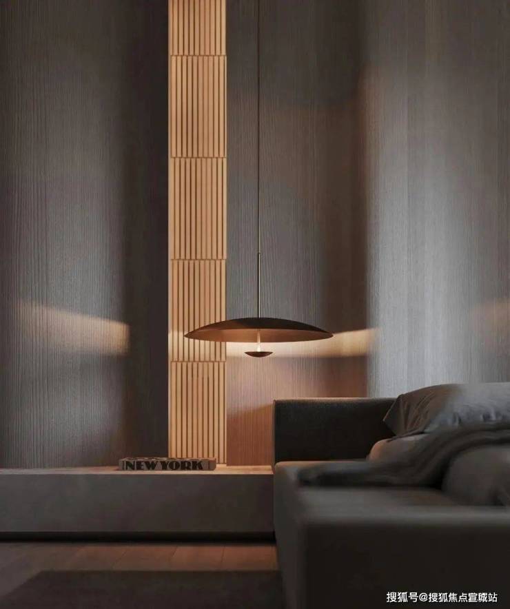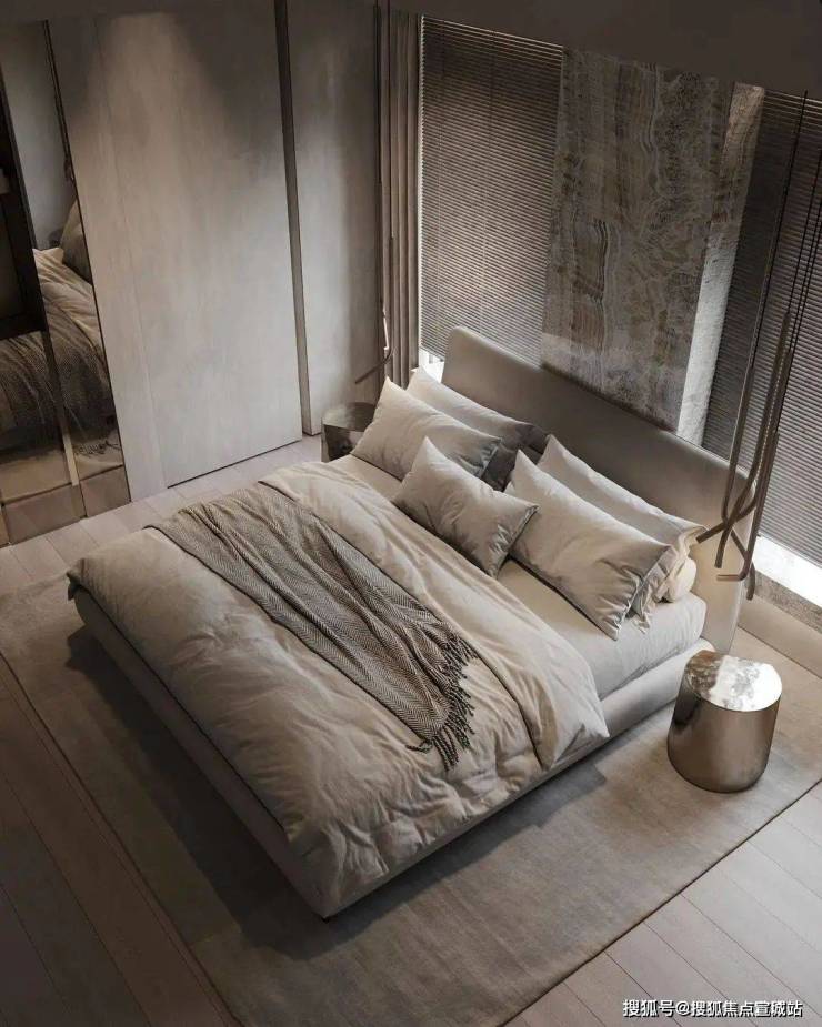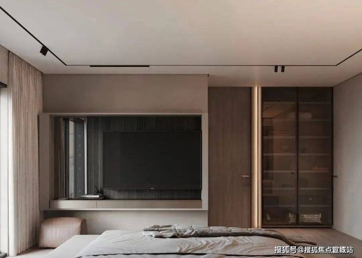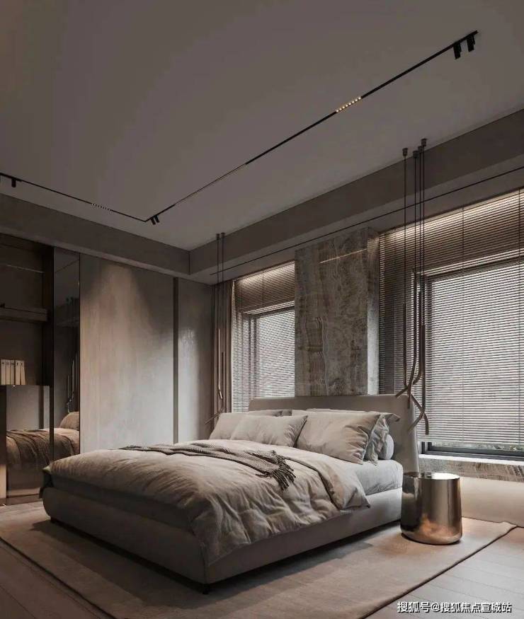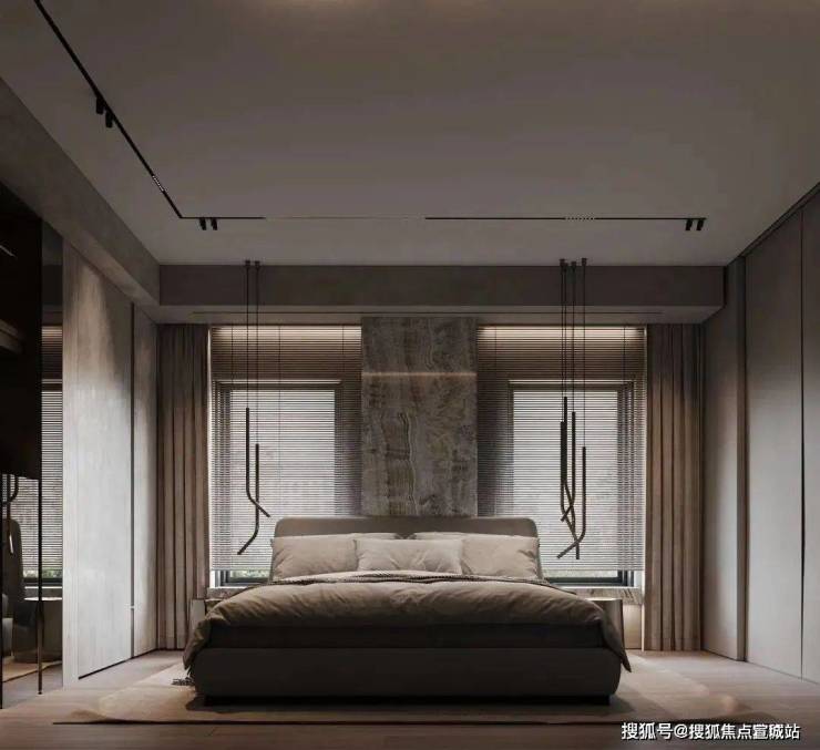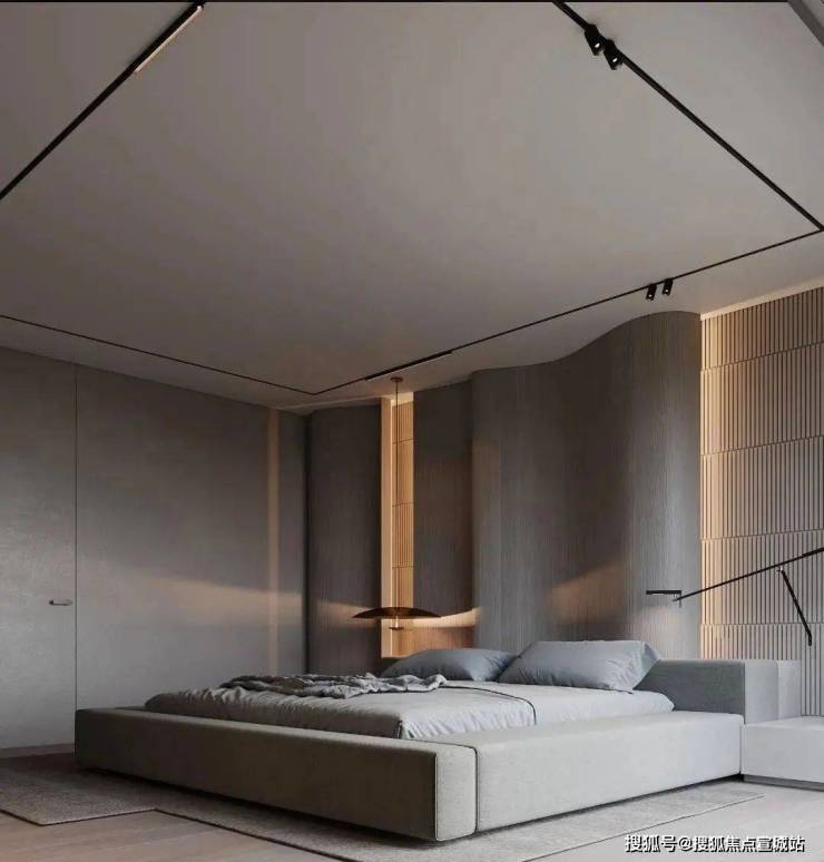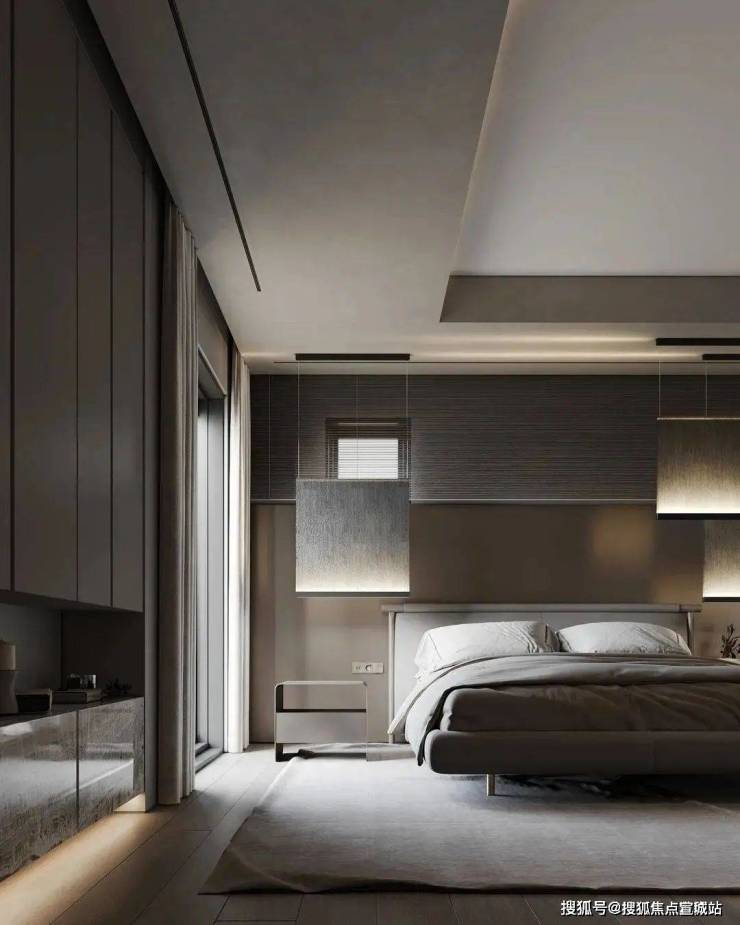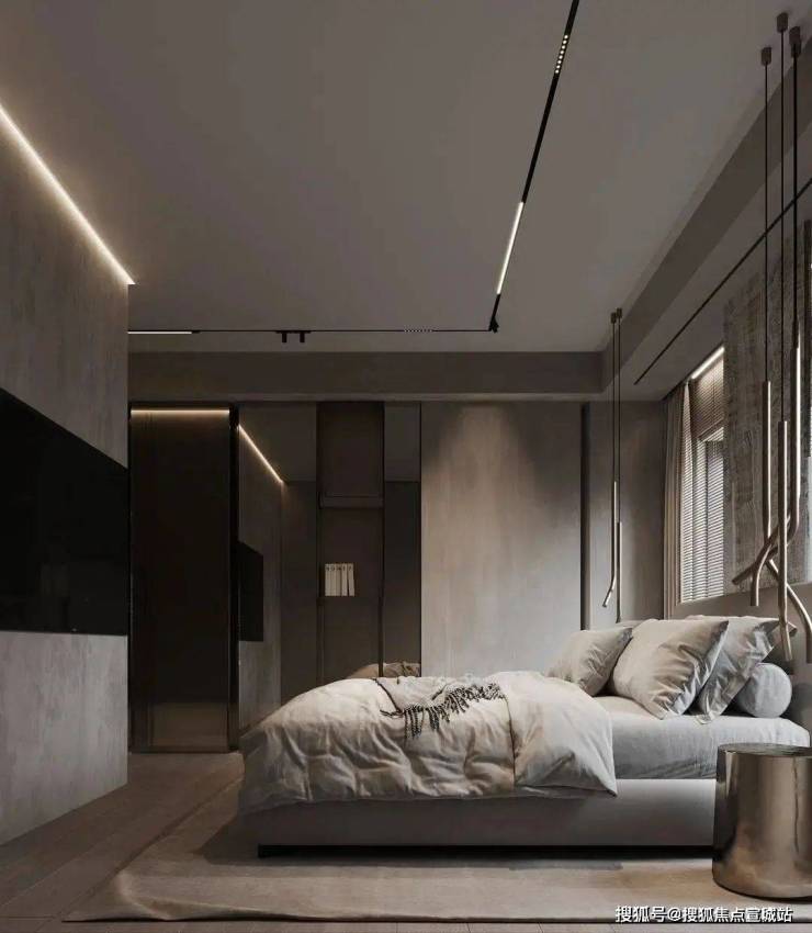 体块与线条的交叠,呈现宁静、知性的卧室氛围,暗藏灯源与自然光线冲淡了空间的克制与冷静,成为中性灰调中的一抹暖意。