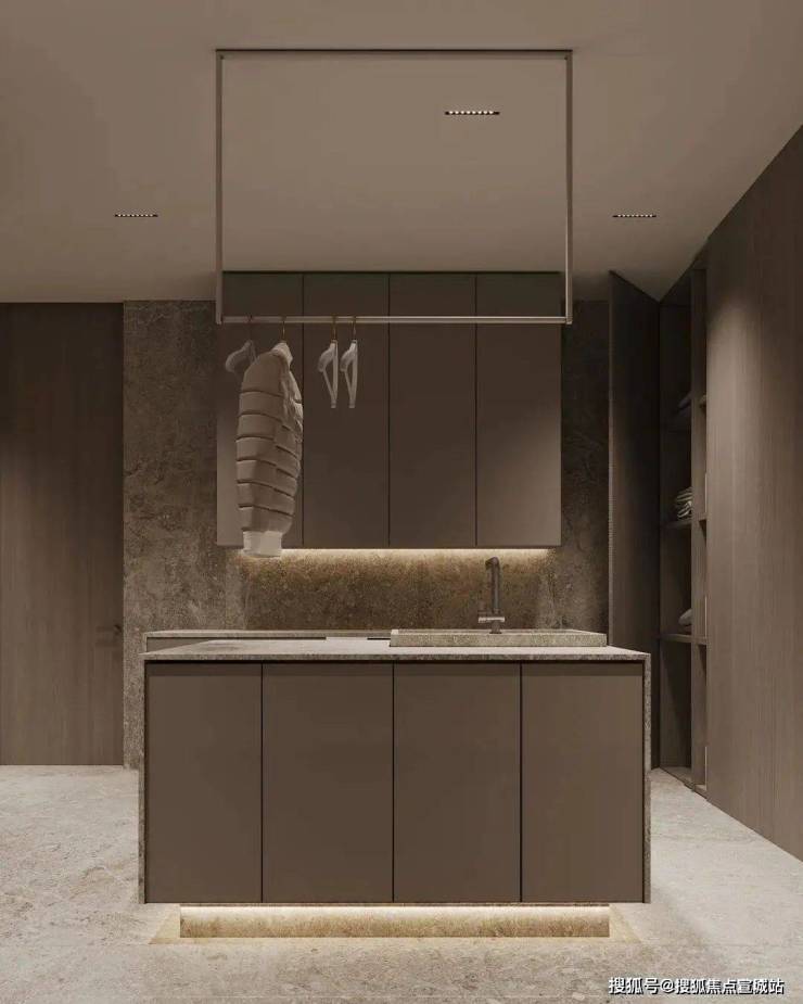 在洗衣房,贴合墙面的柜体定制,按不同存储功能切割,内嵌式家电、开放式置物区及封闭式收纳,打破了单一化的空间视觉形态,展现出强大的收纳功能。