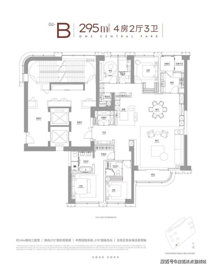 整个户型有几个重点跟大家拎一下:户型实现了 全落地窗环绕、 大横厅结构、 270°弧形窗,极致的通透感、绝佳视野与豪宅空间所需的独立性、全景仓视野被发挥的淋漓尽致,堪称新一代豪宅的居住体验标杆.