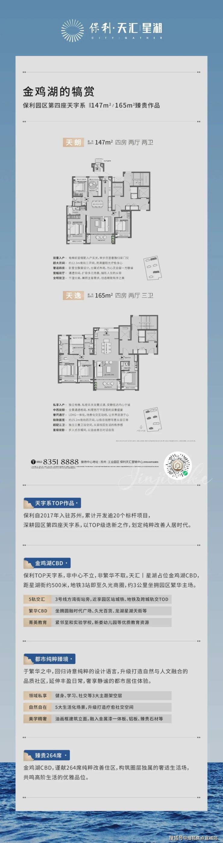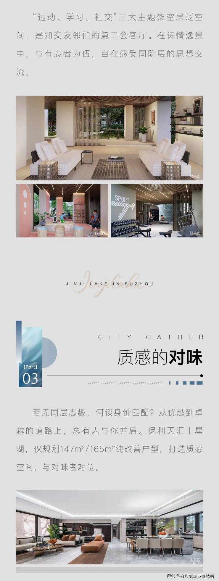 保利天汇星湖】围绕领域私享、美学精奢、自然自在、居所定制等四大主张进行产品迭新,规划6幢17F纯粹小高层,谨献264席稀缺大宅,建面约147㎡/165㎡四房起步改善大户,每一席皆为臻贵资产,补全了金鸡湖CBD高端人居的封面拼图。