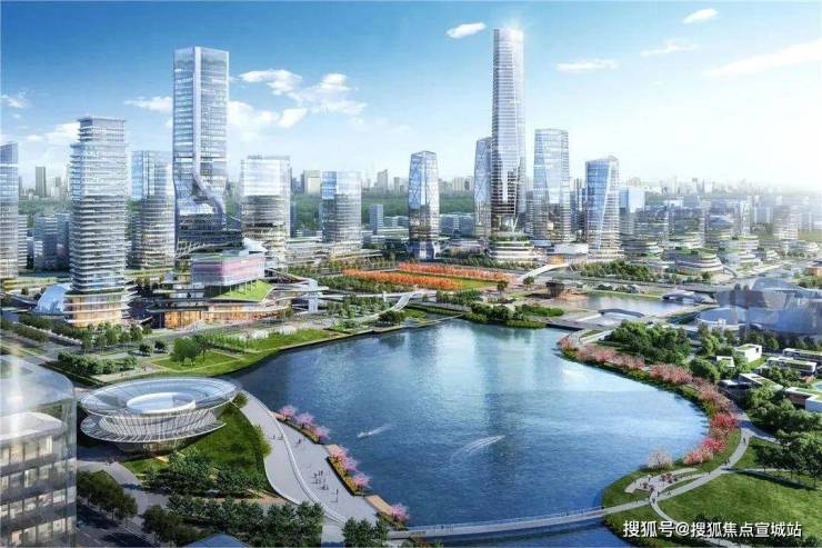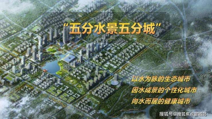 五分城韵:蓝绿景观结合城市功能,塑造多样的场所、丰富的生活体验,景观与建筑相互渗透,水与城有机融为一体,实现“虹桥主城、尚水前湾”的发展愿景。