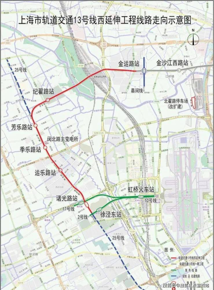 13号线西延伸工程自金运路站(不含)至诸光路站,全长9.47公里,将为虹桥商务区与市中心及浦东的联系开辟新的快捷路线。这条线路大致沿金沙江西路—纪宏路—联友路—金丰路—诸光路走行,可与2号线、17号线换乘。