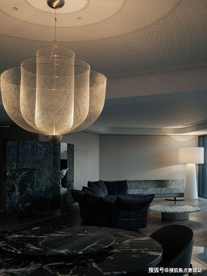 借以Moooi的枝形吊灯向整个开放区域投放出细腻的美感,即便是金属质地却丝毫没有硬朗的质感,光线通过铁丝网散射,营造出温馨而梦幻的氛围.