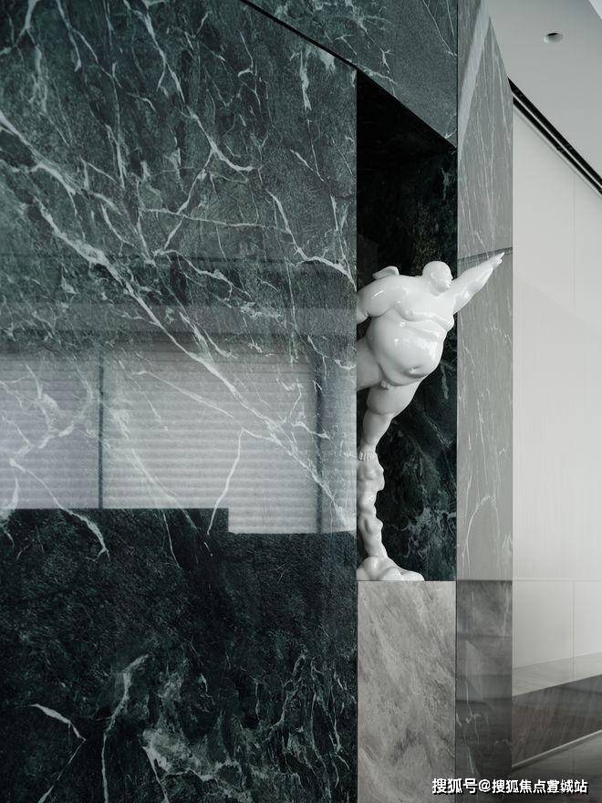 玄关处的大花白大理石端景台完美融入场景,半圆弧线条与美式竖条纹墙面和谐共生.由设计师和业主夫妻三人共同创作的装饰画,灵感来源英国抽象艺术家杰森·马丁的画作,厚重而又细腻的纹理为空间注入艺术灵魂,克莱因蓝的点缀为整个空间增添一抹亮色.