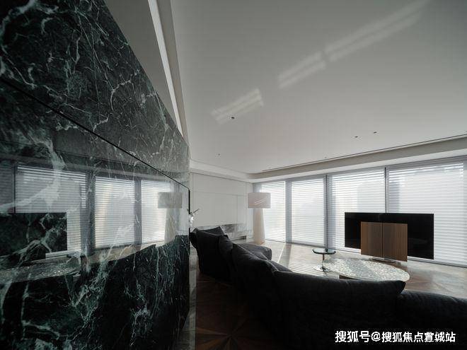 跳脱出固有的客厅设计,让超宽观景落地窗成为电视的天然背景墙,将城市景观置于落地窗内:白天是与秒流动的自然光线,夜晚则是一览无余的现代繁华.