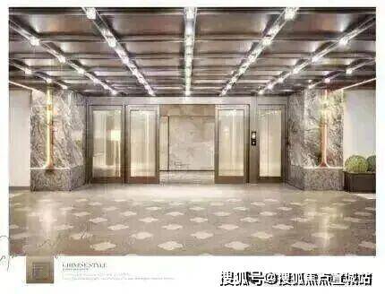地上入户大堂方面,在造型上运用了中式元素挑檐,搭配香槟金型材金石嵌套设计,显示出一种精致奢华却内敛的感觉。