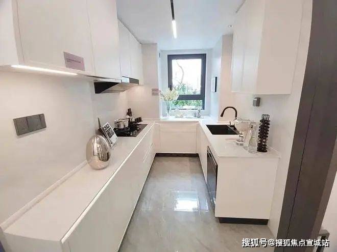 厨房U型操作台面,并配备了洗碗机、末端净水,甚至凉霸,不仅能解放双手,还解决了炎炎夏日厨房做饭闷热的烦恼;