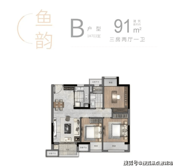 91㎡户型:3室2厅1卫,全明户型,南北通透,餐客厅一体,客厅面宽约3.55米,南向阳台面宽约3.55米,拥有270度环景奢阔视野。