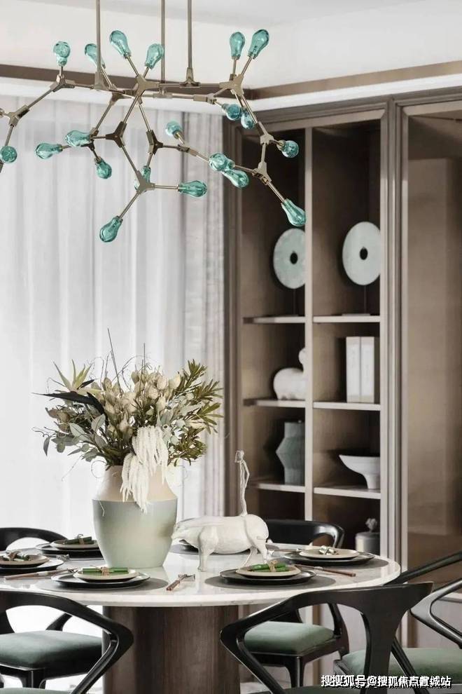 餐厅空间则位于客厅一旁,开放式的格局,赋予了空间更多的开阔感.而餐厅设计之中,以圆形大理石岩板餐桌为主,整体显露简约之感,却也不失家的温馨.