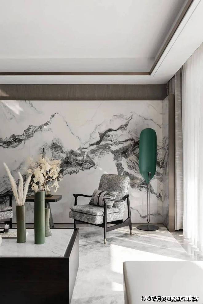 走进客厅之中,仿佛步入一幅山水画作之中一般.组合式的大理石岩板背景墙,以屏风式的形制,赋予了空间一派悠然自得的气韵.
