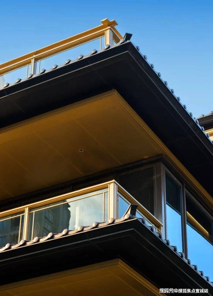 三重屋檐,代表天地人融合的东方宫殿最高等级,上檐、外檐、下檐三重结构,现代立面,以铝板、格栅、石材、瓦墙型材、玻璃等现代型材,彰显传世之宅的独特气度。摒弃早期中式建筑的白墙黑瓦,精研居住建筑的材质与色彩搭配,注重冷暖的多重对比。中式建筑的立面呈现出的不是粉墙黛瓦,而是「宋韵五色」。