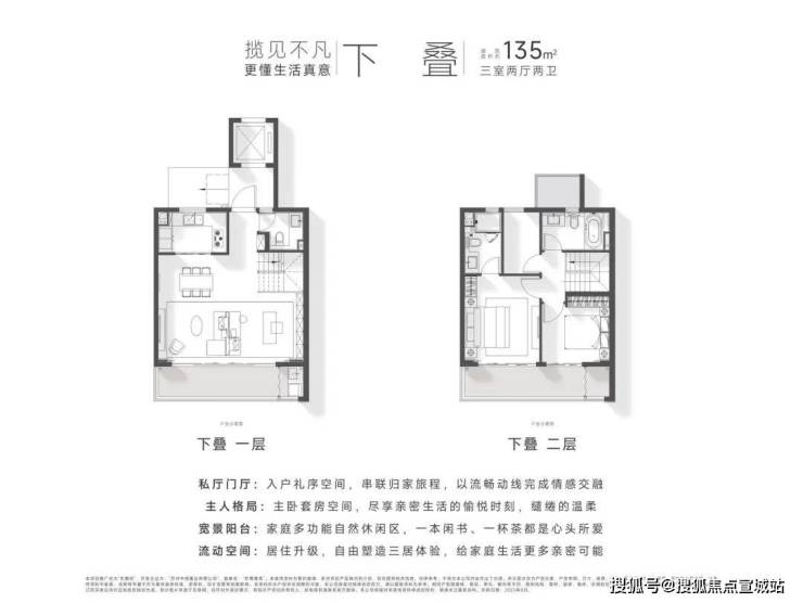 定制空间:全横厅设计、LDK多功能家庭区;功能间配置+灵动空间设置;建面约135㎡以上户型,全3卫配置,居住品质更高。