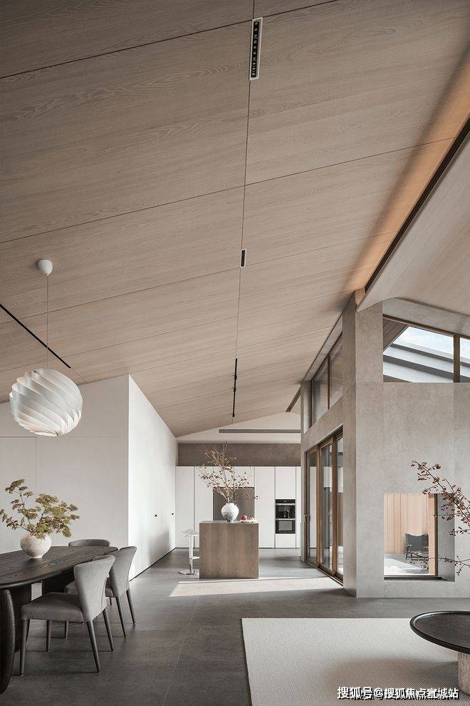 两面式沙发,打造出更随意的坐卧选择与舒适体验。木质吊顶铺展延伸,层次错落有致,仿若将室外的自然意境延伸到了屋内,简雅质朴而温润有加。
