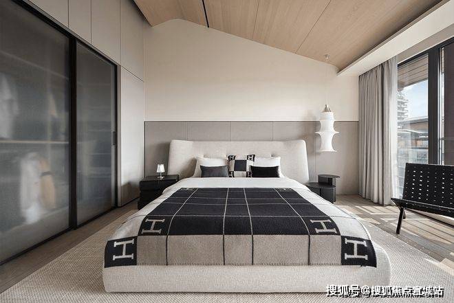 卧的斜形顶与整体空间相呼应,以质感深色作为主色调,营造出沉稳内敛的休憩氛围。