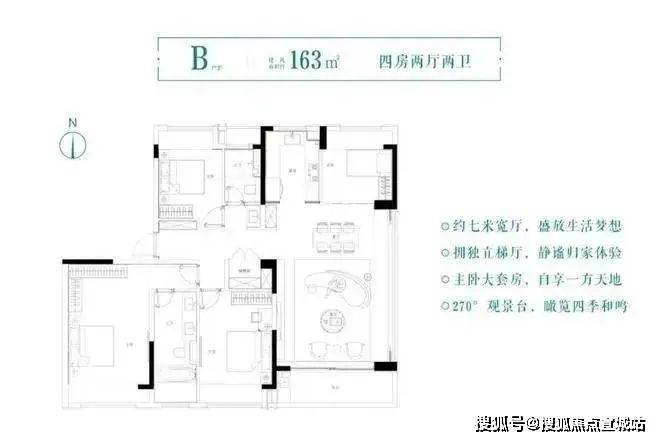 【产品详情】由5栋17层小高层组成,共165套,打造纯粹四房住区