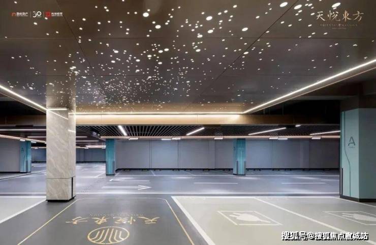 比如豪华星空顶地库,顶部星光顶是穿孔铝板,搭配LED灯带,满满科技感。车道做了格栅样式的吊顶,地面采用橘皮环氧地坪,既保证了美观度,又非常实用。