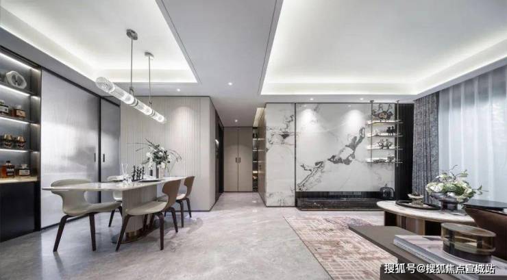 张江金茂府3.0户型得房率接近80%,其阔绰度在同价位段产品中也堪称第一梯队。以客餐厅为中心点的飞机户型,自然延伸到各个房间,没有多余的过道空间,减少空间的浪费。