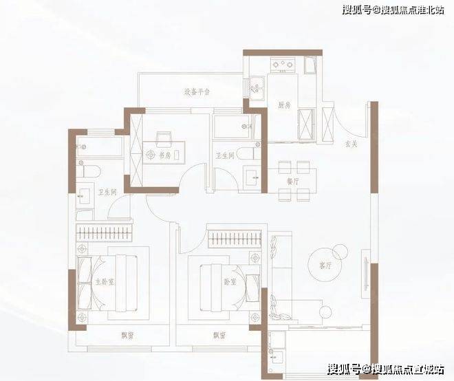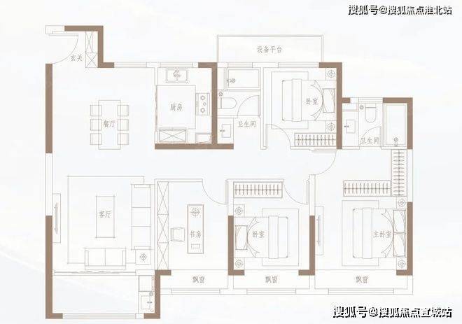 138㎡户型开间阔绰,4室2厅2卫,三房朝南,均赠送飘窗。