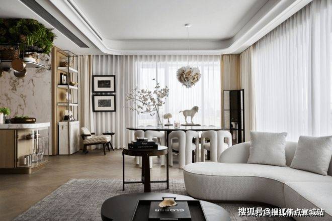 客厅空间采用大量造价昂贵的弧面设计,带来更有格调的审美价值: