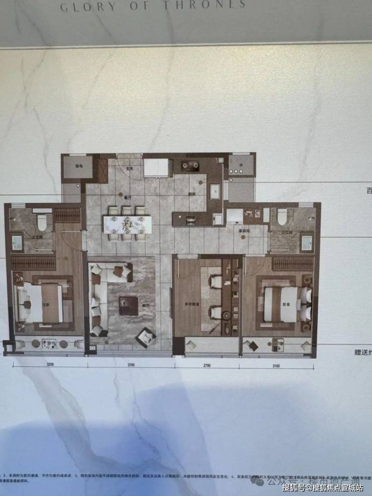 优点:这个户型很罕见,像升级版的中间套,客餐厅可以实现南北通透,空间感非常好;三房全部赠送飘窗,连北面的书房都赠送了飘窗;北面设备平台相当于晾晒区,只需从书房穿出,非常方便