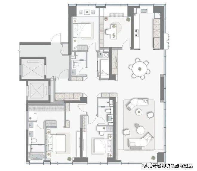 建面约249㎡户型,四房两厅三卫设计,颠覆了超高层住宅普遍低得房率的传统观念,实现了约79%的高得房率!