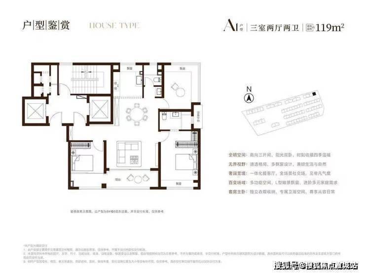 3室户型:建面约119㎡3室2厅,南北通透全明格局,户型方正,实际可利用面积率超过90%,空间尺度媲美常规140㎡户型^;