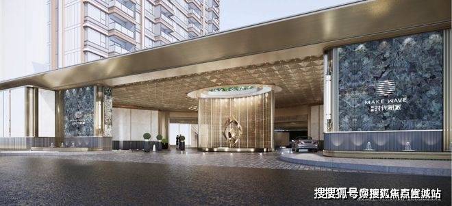 同时,入户大堂立面造型延续了主立面的框与线结合,飘顶弧形雨棚,组成高定入户大堂,增加入户仪式感。