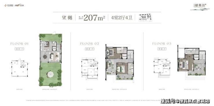 以主力户型建筑面积约207㎡为例,四房两厅四卫,实现平均约50%的院房比(不同房源,庭院面积大小不尽相同),同时打造约9米景观面,让院子的尺度与客厅等比同宽。丰富的院落组合,围合出归属感和领域感,内含亲情,外合邻里,满足院落生活的本真向往。