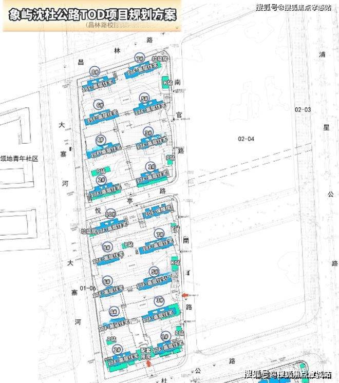 01-03(中间),规划10幢楼,其中一幢为保障房,总高17-18-20层,小区中心位置的商品一楼为架空层,南北楼间距30米.