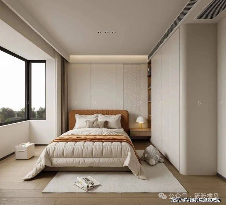 儿童房的设计上以简约为主,跟随公区一致的无主灯设计,为了美观,我们设计师设计了加长风口,做简单的板带线,让吊顶看起来对称;在空间内的配色上以简洁的米白色为主,加上橙色点缀,增加童趣。