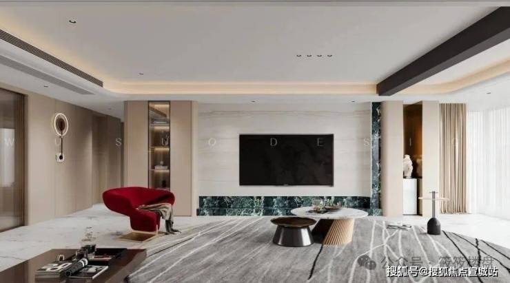 沙发背景墙用连纹的飞天岩板,我们在地面选择了连纹的浅色大砖,搭配上红色丝绒材质的单椅,以及大面积的木饰面,这些材料通过巧妙的混搭与组合,提升了空间的奢华感。
