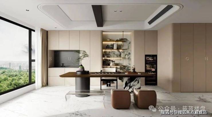 设计师采用【洄游动线】串联起整个空间,让客厅、餐厅、中西厨形成南北通透的视野;整面落地窗将自然光引入10米超长阳台,圆弧异形沙发与飞天岩板墙面构成几何对话;整体的色彩上明亮大气,加上金属、岩板等材质的叠加,为居住者打造一方高雅时尚的精神岛屿。