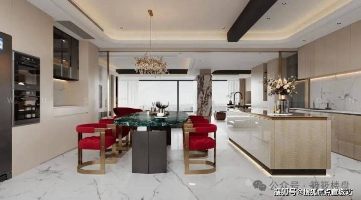 从配色上看非常的符合轻奢中奢华的特点,大胆而热烈的餐桌椅配色、造型别致的金属吊灯,同时氛围灯带的点缀,让整个空间都散发着高级、舒适的感觉。