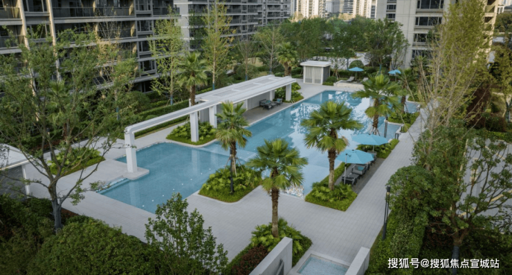 泳池构架以白色为主色系,蔓延的水系丰富了视觉层次,时刻上演假日时光。居者随手挽起一泓碧水,感知静谧晚风拂来,柔和视觉,亦舒缓心境。