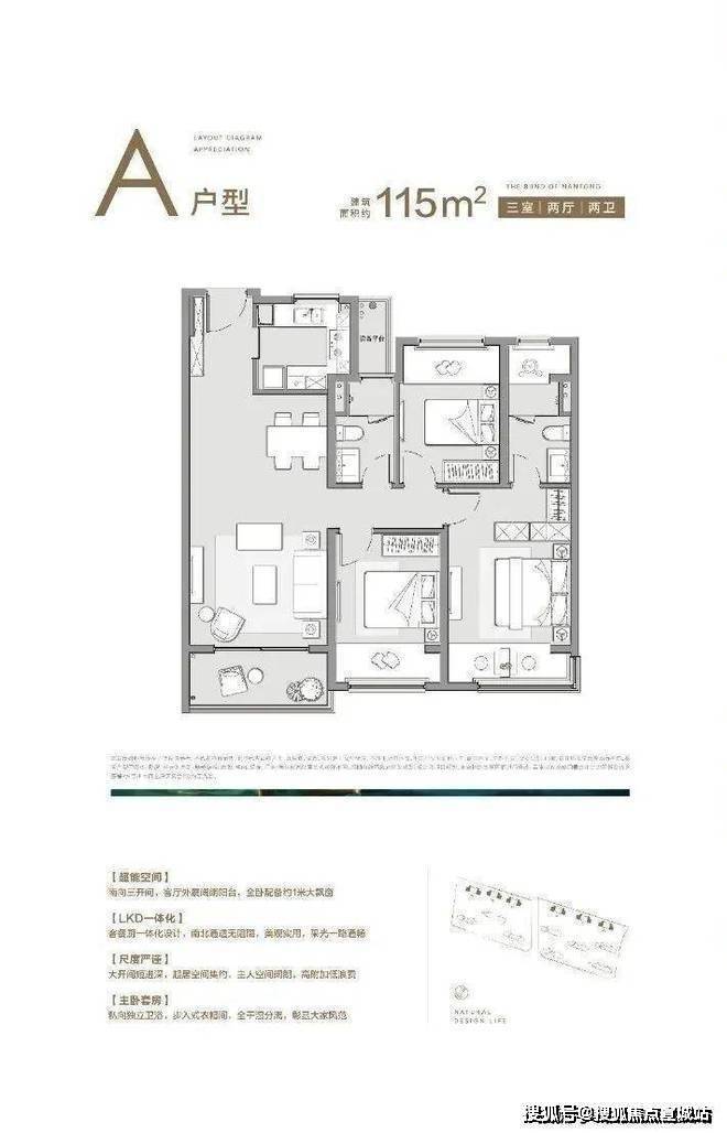 三开间朝南,客厅外展尺度阳台,采光丰富;餐客厅竖向联厅设计,动线空间集约,生活互不干扰.