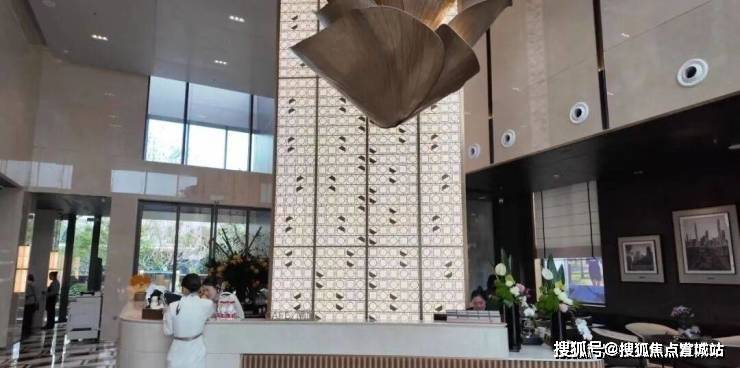 酒店式落客门庭很有气势,采用定制化拼花铺装,同时在两侧打造了静谧的水景,与对面的桃浦中央绿地相呼应。
