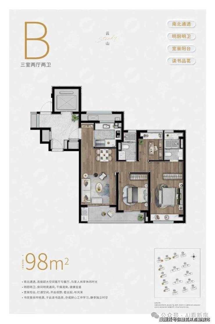 约98㎡3房2卫户型,三开间朝南,并且这贯穿客厅+次卧的超大阳台实在是惹眼,这个南向的视野延展度以及采光度相比同级别的户型来说,要更加出色。