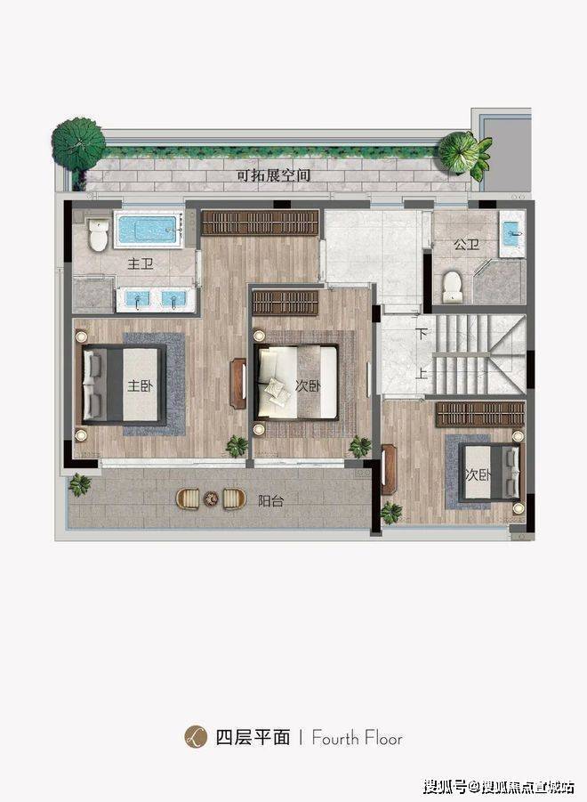 下叠四房两厅三卫的设计。一层南向整体面宽约10.8米,餐客厅一体,连通约7.2米的长阳台,大横厅与落地窗的搭配,增加了室内空间与庭院的互动。