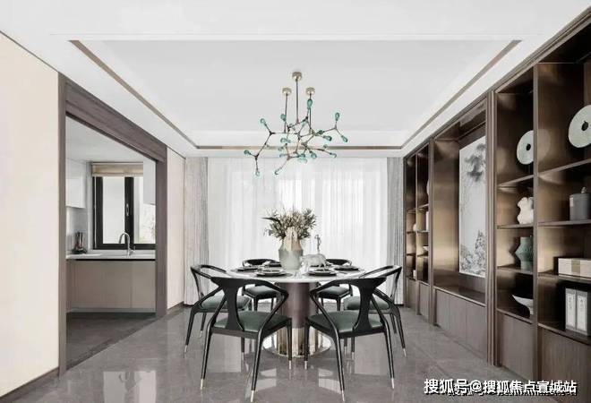 餐厅在整体设计上,沿袭了客厅的配色和风格,简约却又不失格调,尤其是山水墨画元素的融入,让用餐氛围更显温馨感。